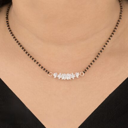 Celebrate elegance with this beautifully crafted mangalsutra necklace, featuring a delicate floral-inspired diamond centerpiece. Designed with a graceful arrangement of marquise-shaped stones, the pendant creates a soft leaf-like pattern that symbolizes beauty and harmony.