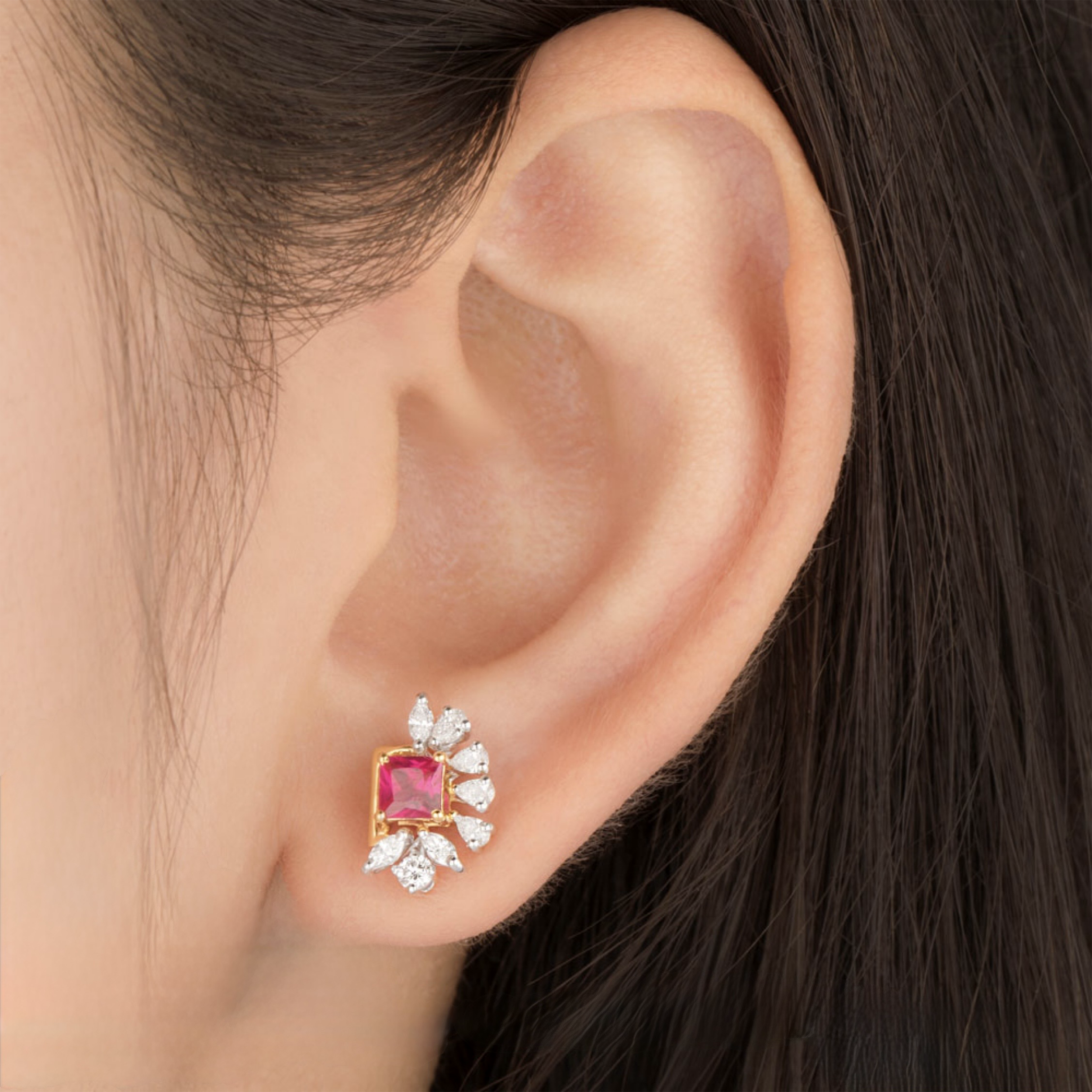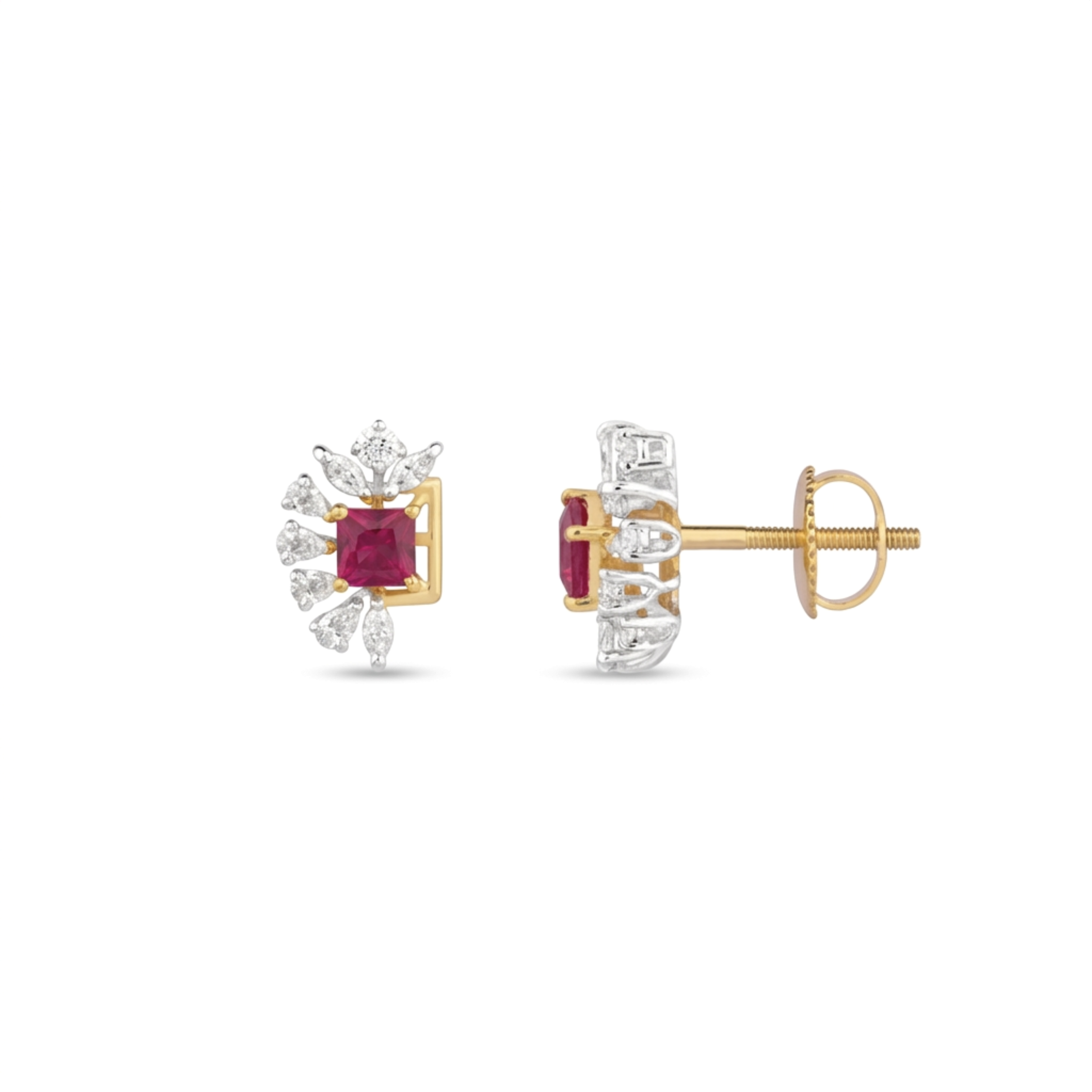 Command attention with these striking studs centered around a vibrant square-cut crimson gemstone nestled within a contemporary gold frame. A dazzling spray of marquise-cut accents fans out to one side, offering a unique asymmetrical flair that feels both modern and classically royal. These earrings are the ultimate choice for those looking to add a sophisticated pop of color and architectural interest to their evening attire.