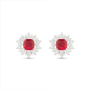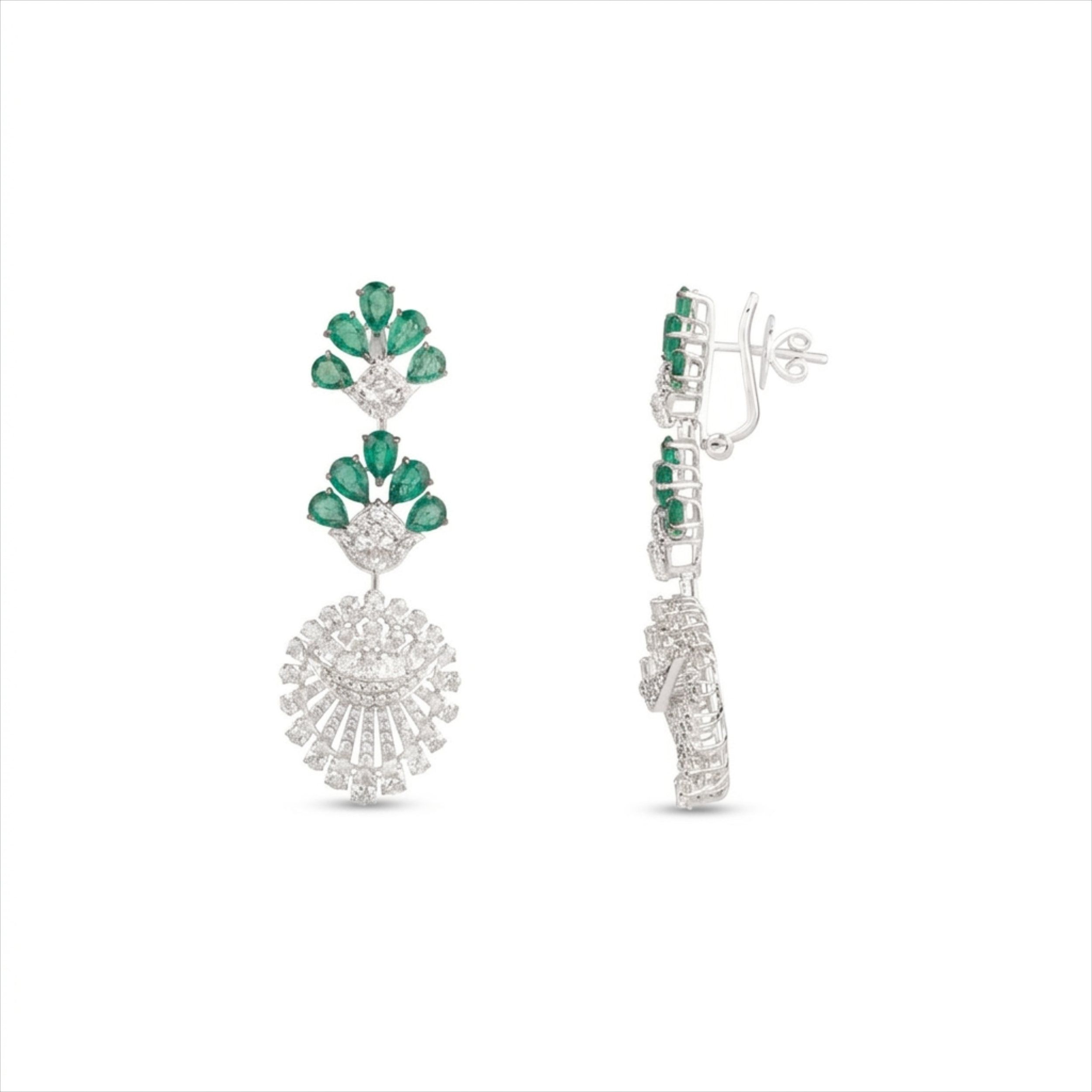 They feature captivating pear-shaped green color stones, beautifully complemented by an array of dazzling fancy shaped diamonds.