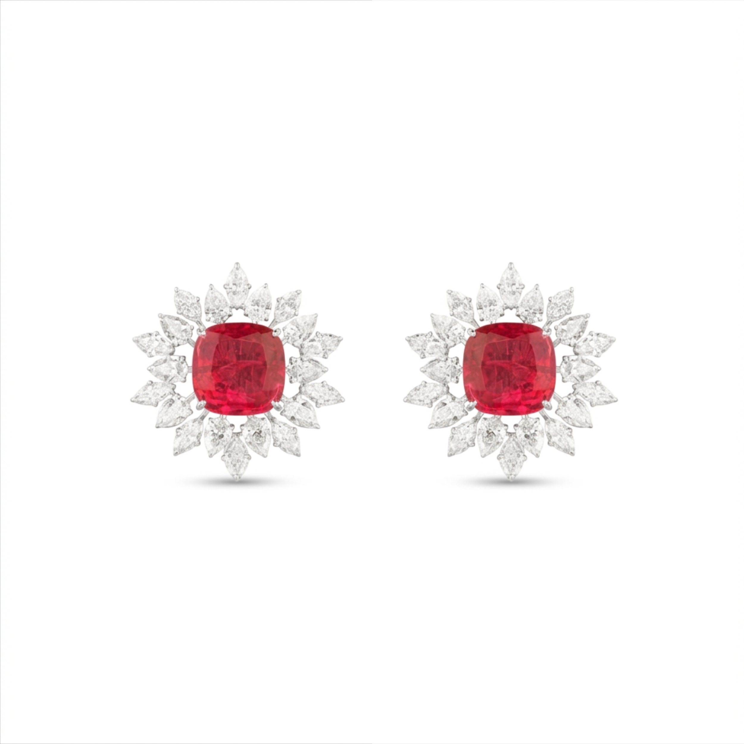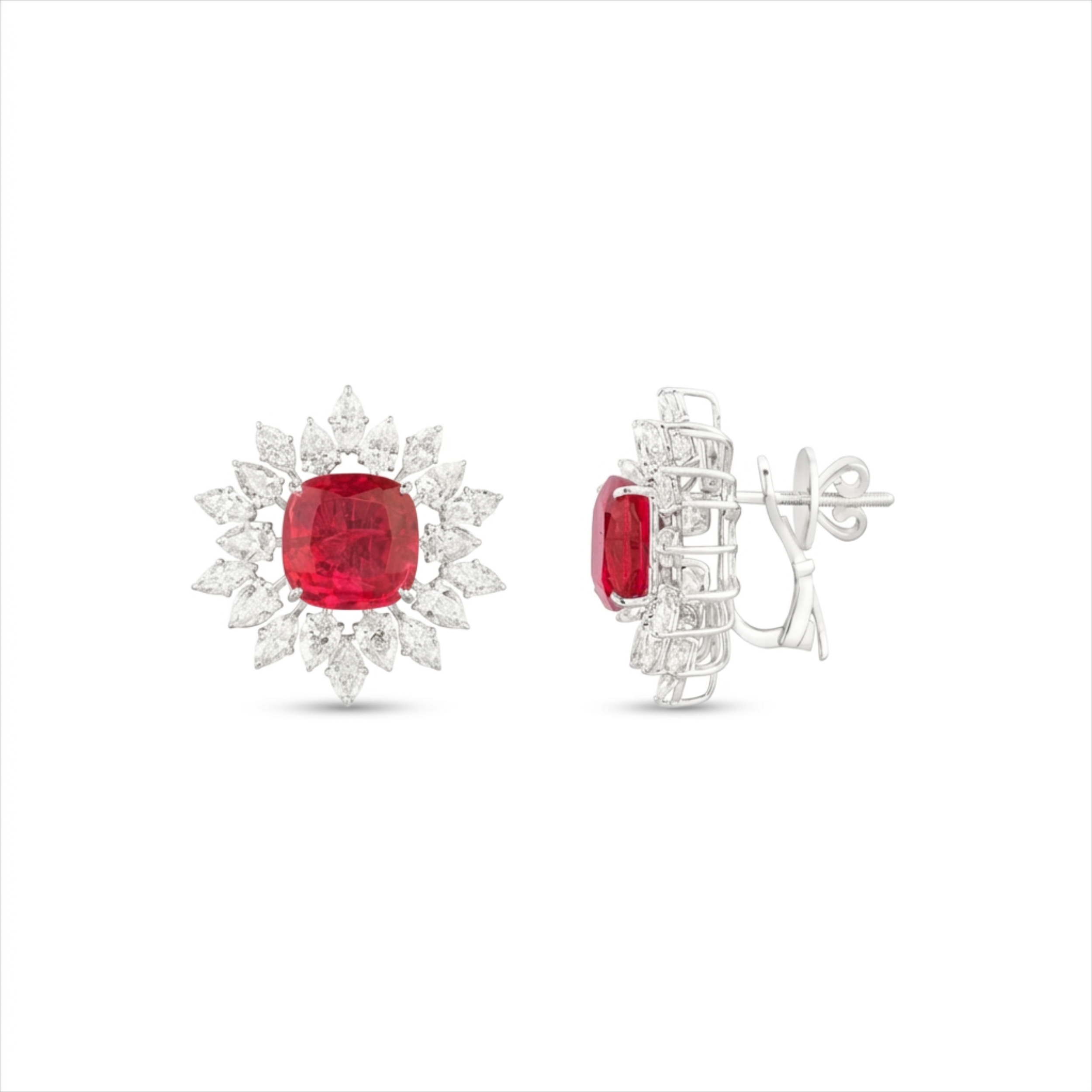 Floral-inspired halo earrings featuring a cushion-cut synthetic ruby centered in a brilliant sunburst of marquise-cut white stones.