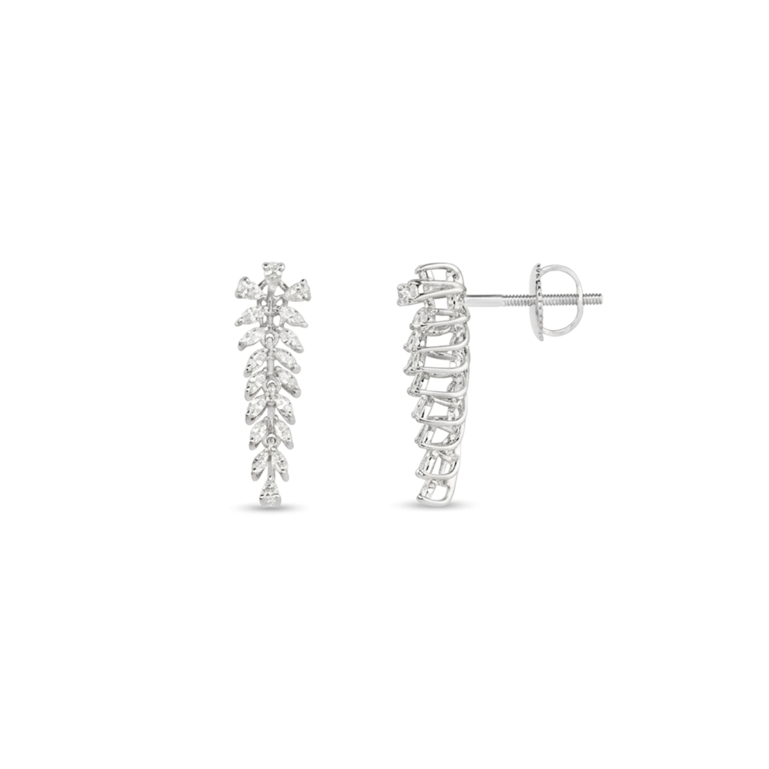 The grace of nature is captured in these exquisite drop earrings, featuring a cascading vine of shimmering marquise-cut diamonds. Each stone is meticulously set in white gold to create a fluid, light-catching silhouette that elongates the neck. These elegant pieces offer a timeless sophistication, making them the perfect finishing touch for a refined evening look.