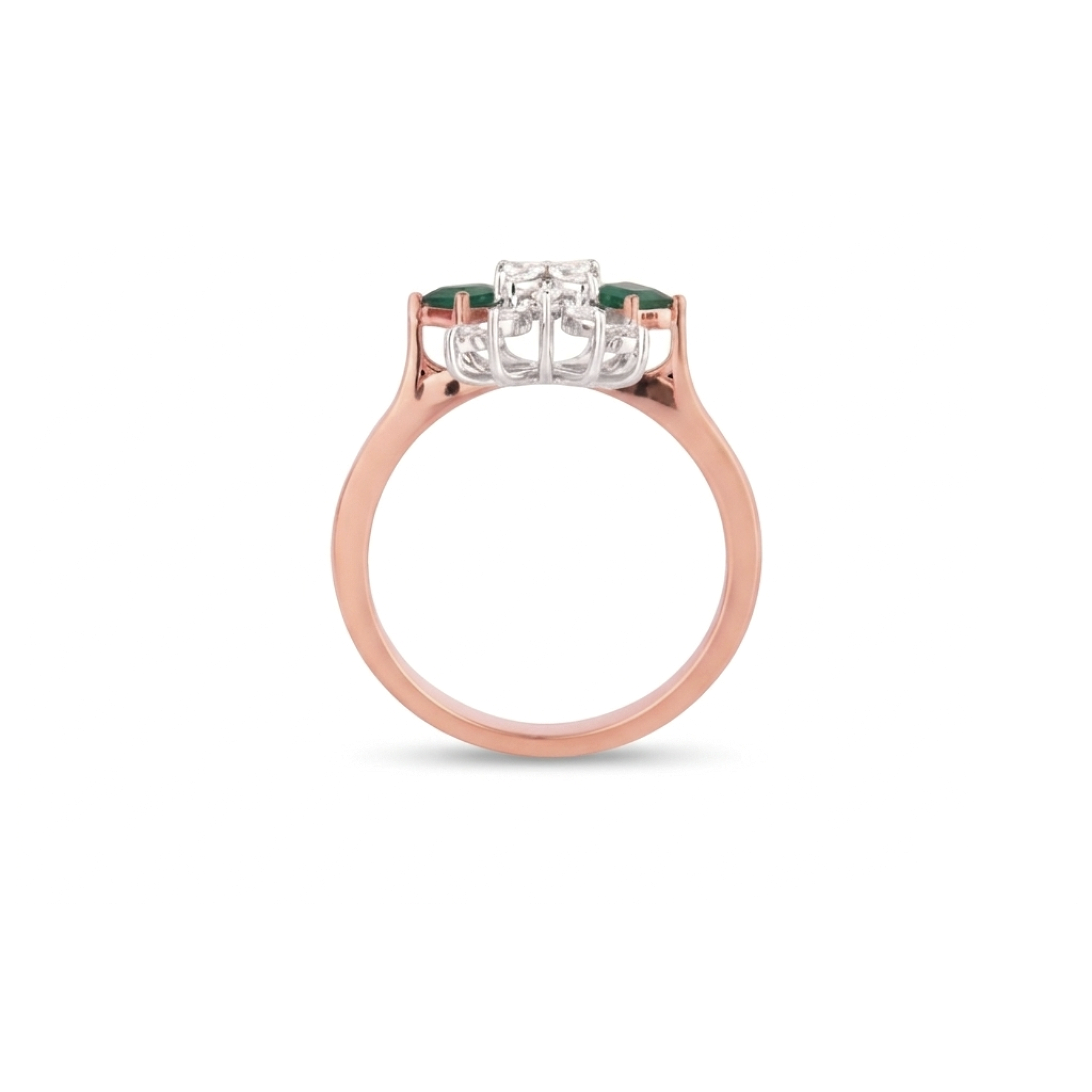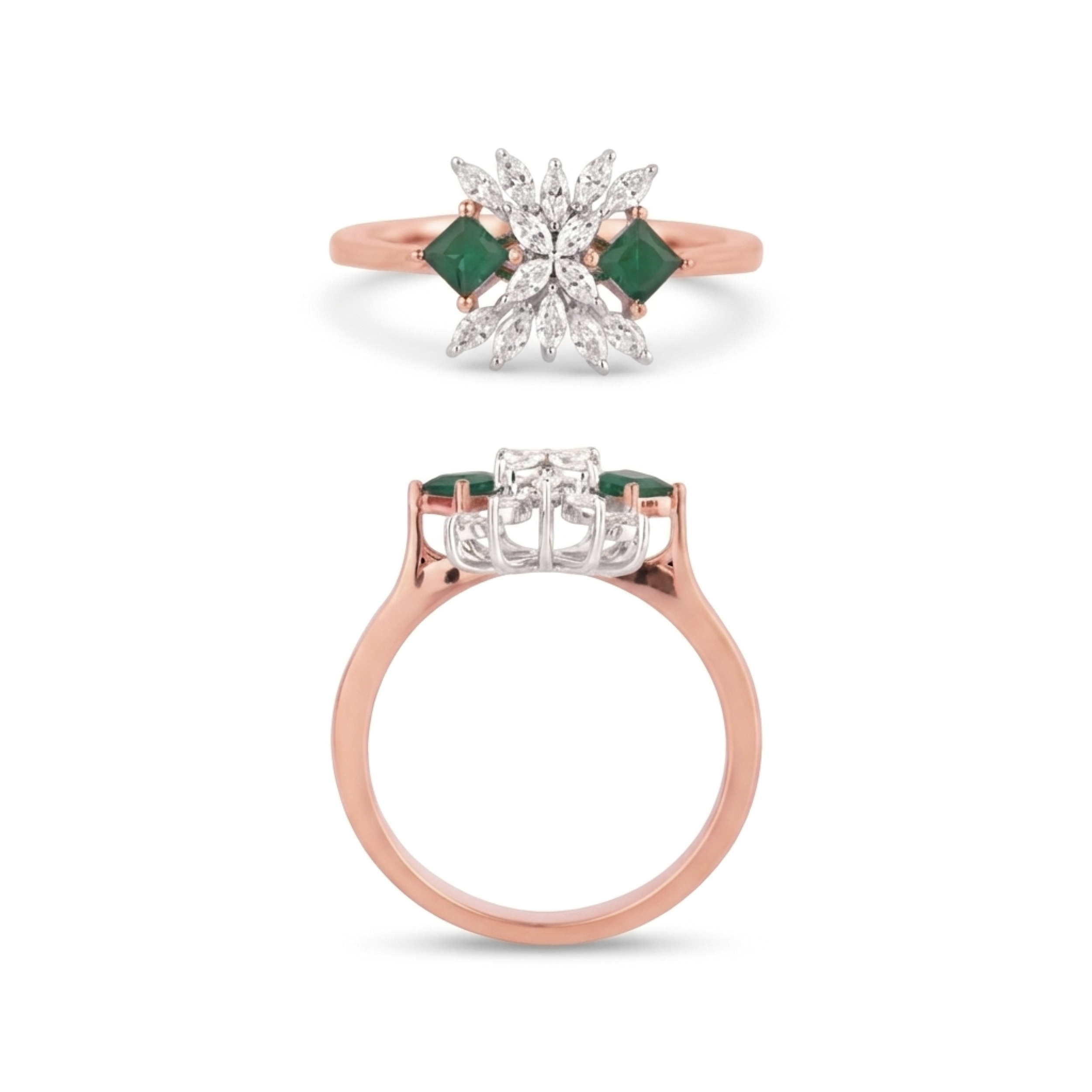 Twin green gemstones paired with a dazzling diamond floral centerpiece.