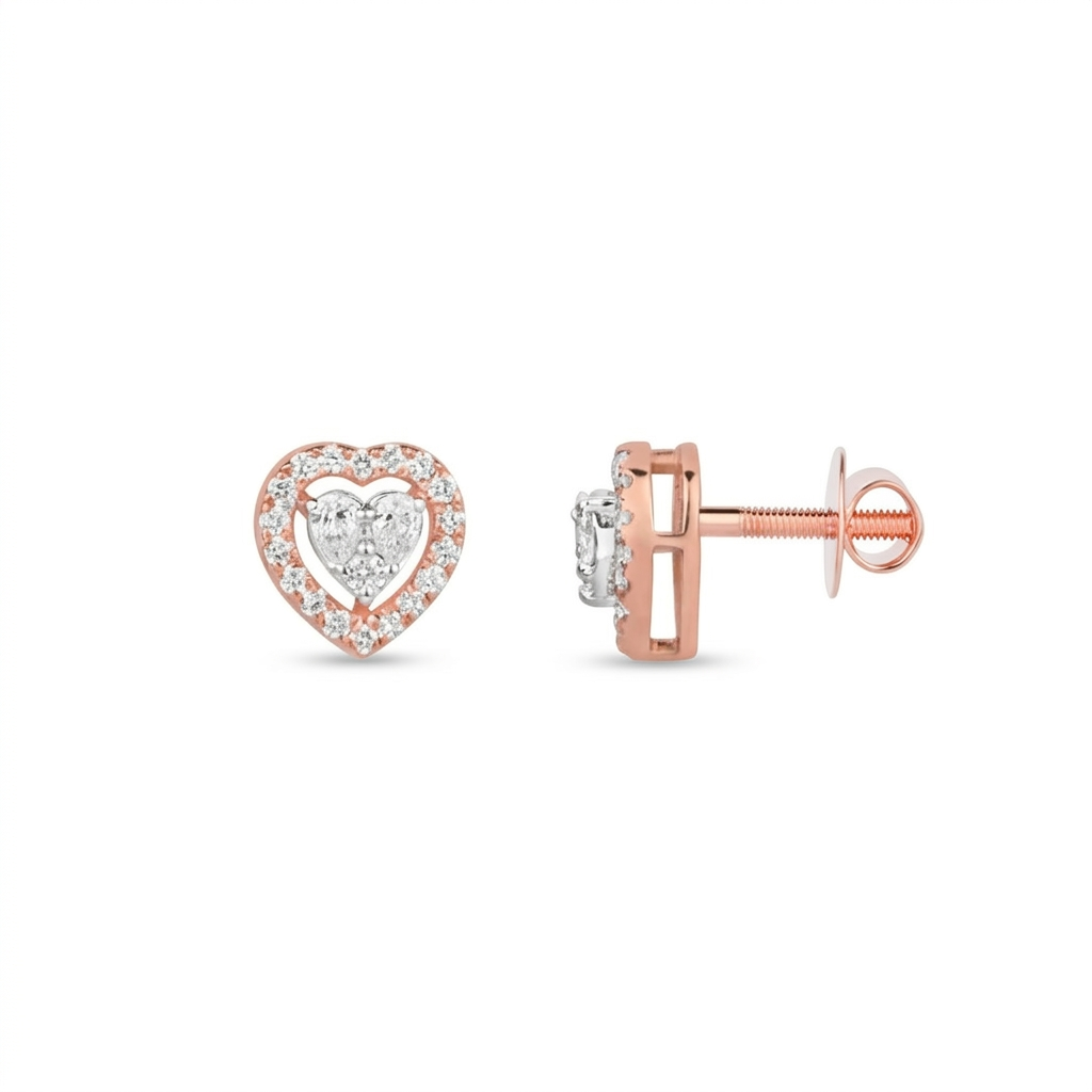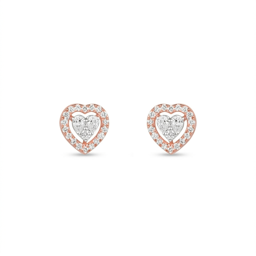 Elegant and timeless, these heart-shaped diamond stud earrings feature a sparkling center cluster surrounded by a delicate halo of diamonds. Crafted in a beautiful rose gold finish, they add a romantic charm and subtle brilliance to your everyday style—perfect for gifting or special moments.