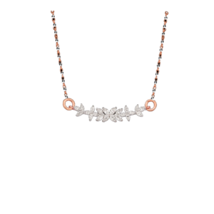 Celebrate elegance with this beautifully crafted mangalsutra necklace, featuring a delicate floral-inspired diamond centerpiece. Designed with a graceful arrangement of marquise-shaped stones, the pendant creates a soft leaf-like pattern that symbolizes beauty and harmony.