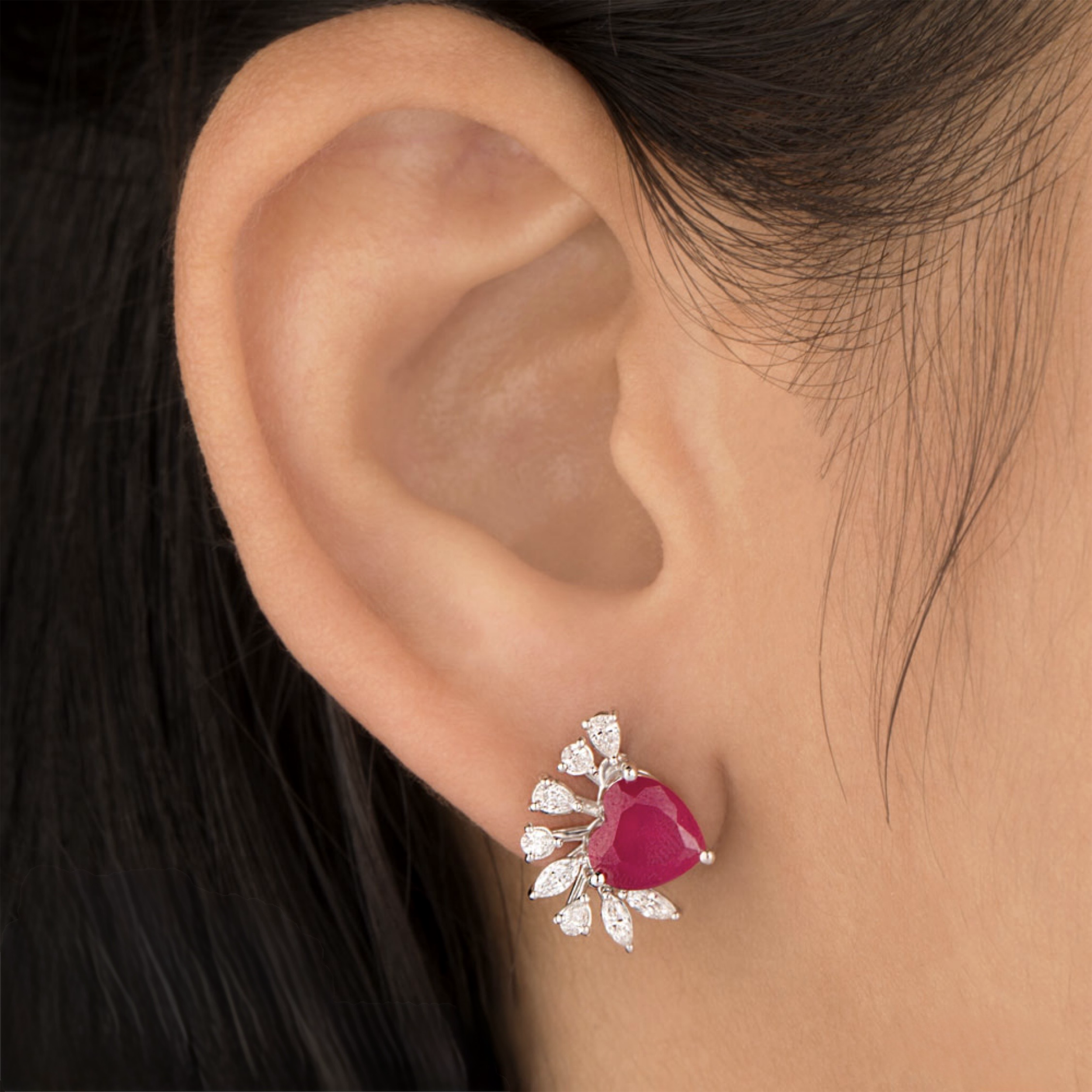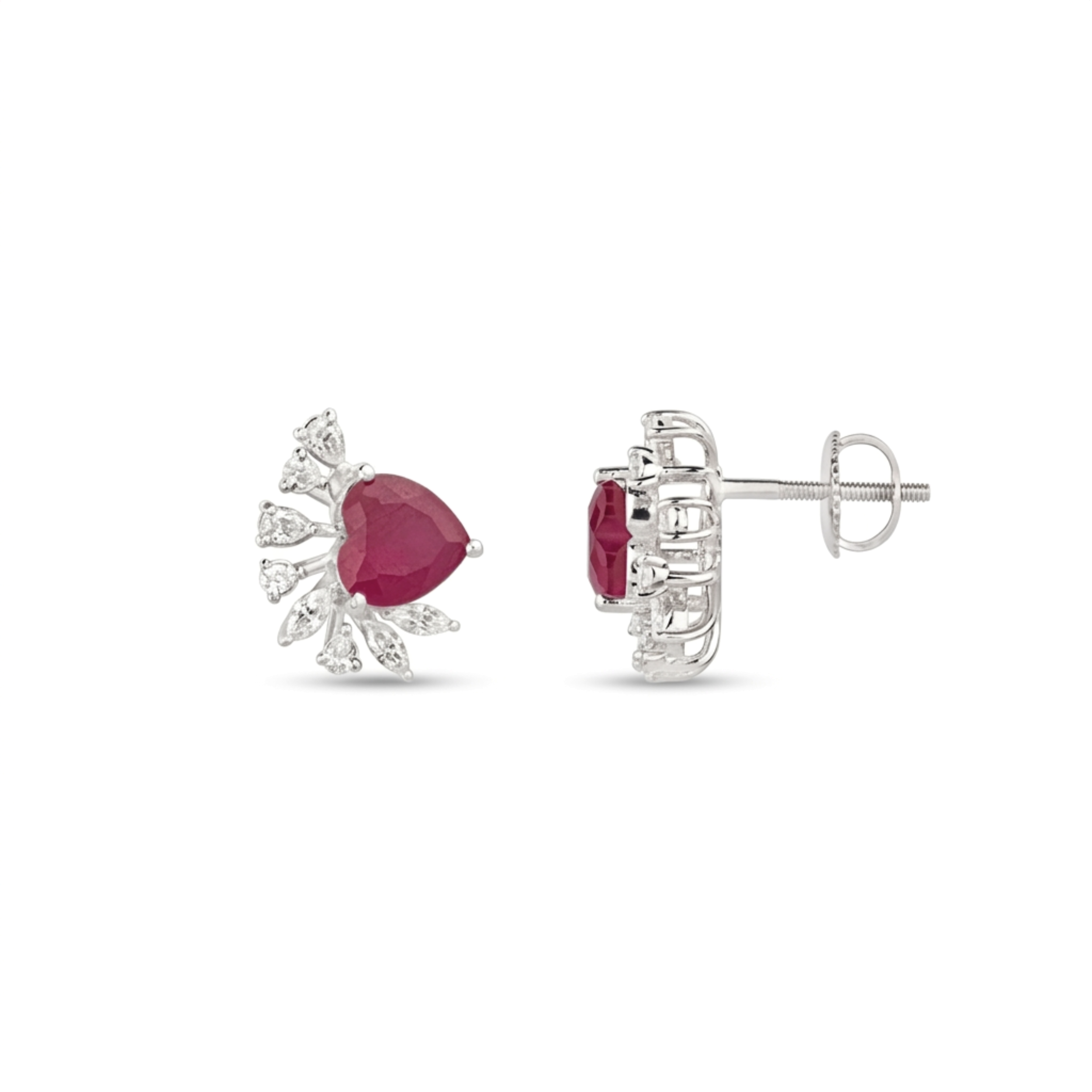 Celebrate the art of romance with these exquisite studs featuring a deep scarlet heart-shaped gemstone held in a sleek silver-tone setting. The rich center stone is dramatically enhanced by a sweeping wing of brilliant-cut diamonds that follow the curve of the ear for a winged, ethereal effect. Perfect for adding a touch of passion and sparkle to your look, these earrings offer a bold yet feminine statement that transitions beautifully from day to night.