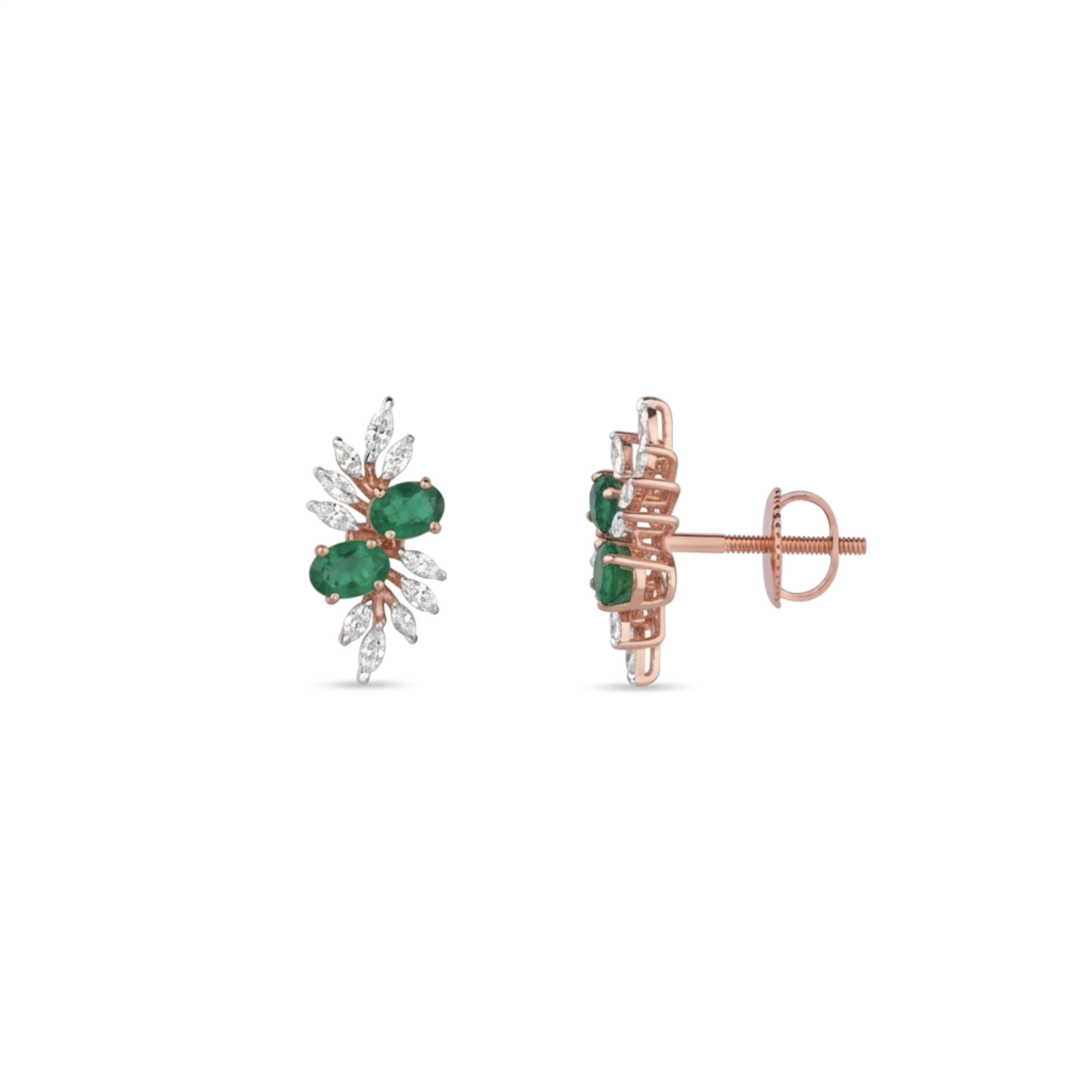Lush oval-cut emeralds are nestled within a whimsical vine of marquise diamonds and delicate rose gold stems. The asymmetrical, upward-sweeping design mimics organic growth, offering a modern twist on traditional gemstone jewelry. With their rich green hues and romantic metal tones, these earrings bring a fresh and sophisticated energy to your jewelry collection.